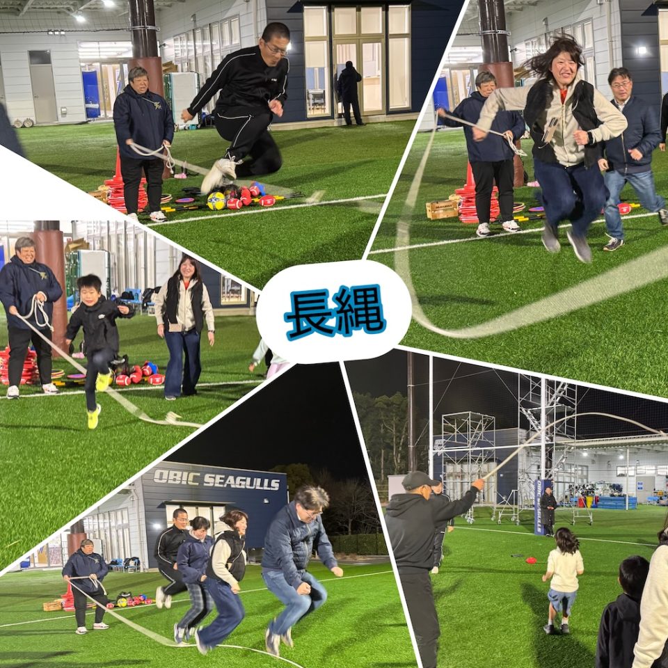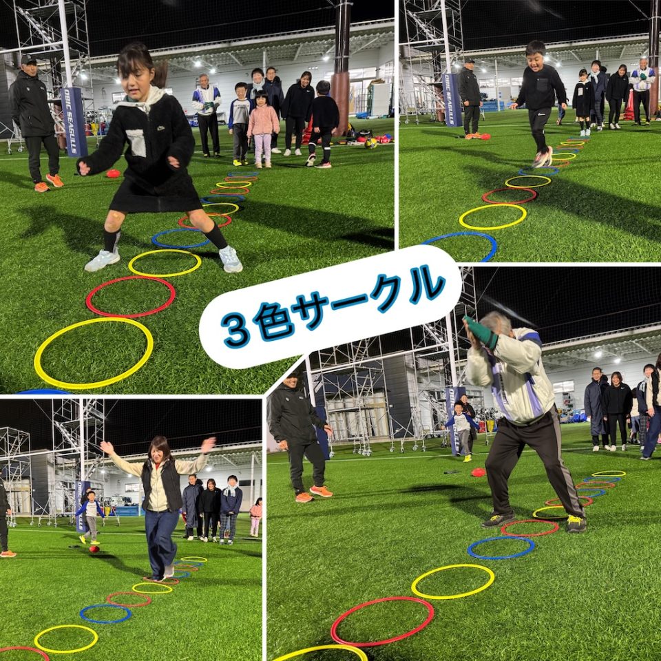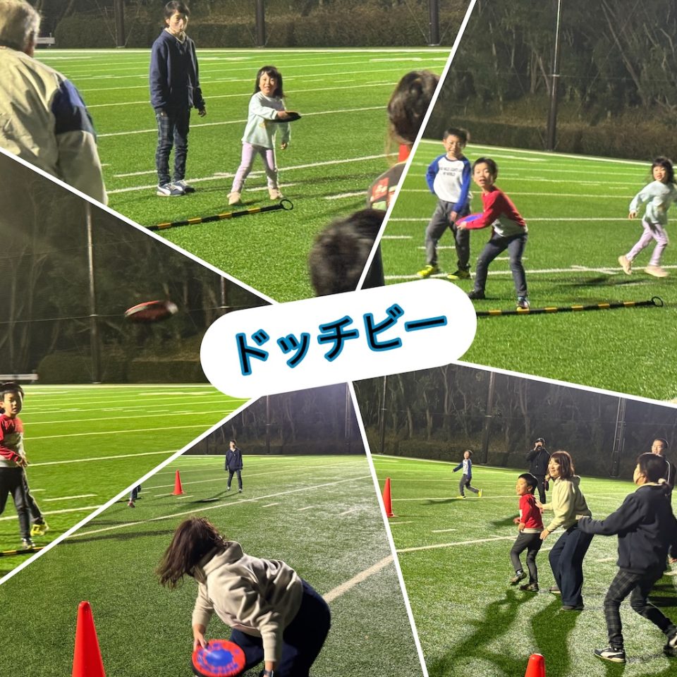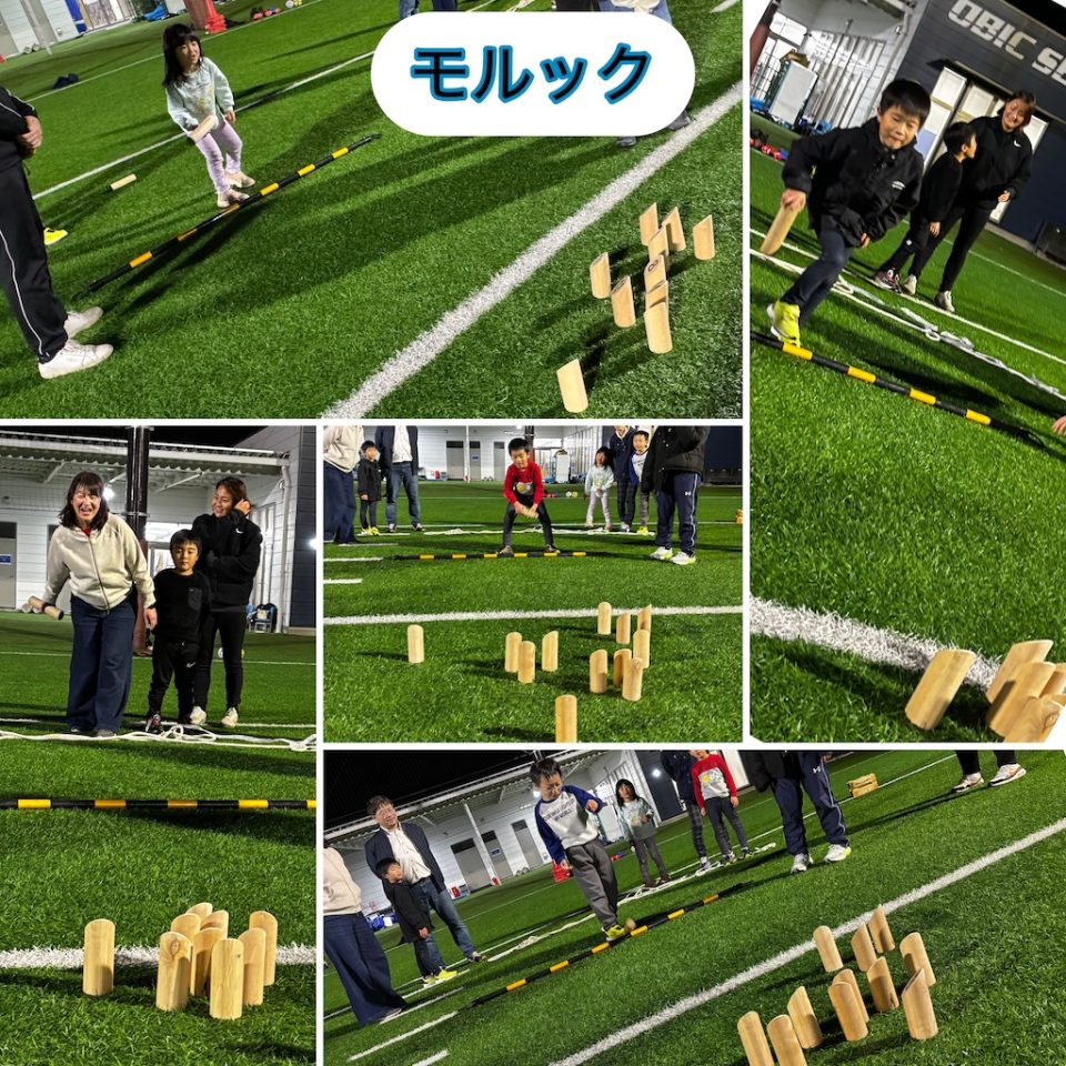 第7回「スポーツで遊ぶ日」開催しました(12/17開催) 2025年12月19日 イベント・教室 毎月開催している「スポーツで遊ぶ日」、今回は7回目の実施となりました。この日は5家族14名が参加。少人数ならではの一体感のある、あたたかい雰囲気の中で開催しました。 12月に入り寒さも本格化し、屋外で身体を動かすのが少し億劫になる季節。しかし、年末年始を迎えるこの時期こそ、体調管理や(特に大人にとっては…)体重調整にもぴったり。寒さに負けず、しっかり動いて、しっかり笑う一日となりました。 ◆ 3色サークルステップ(ウォームアップ) 最初の種目は「3色サークルステップ」。赤・青・黄の3色の輪を12個並べ、色ごとにステップの方法を変えて進みます。途中からは手拍子を加えるルールもプラス。一見シンプルな動きですが、実際にやってみると一気に難易度アップ!「わー!」「きゃー!」と声が上がり、最初から会場は大盛り上がりでした。 ◆長縄(ウォームアップ) 続いては長縄跳び。1人ずつ入って跳んだり、3人同時に跳んだりと、徐々に身体を温めていきました。寒さで縮こまっていた身体も、気づけばポカポカに。 ◆ドッヂビー:スリル満点の展開に! 3種目目は、久しぶりに登場した「ドッヂビー」。子どもたちに大人気のプログラムです。 4チームに分かれ、7m四方のコートで3分間ゲーム。1試合目はドッヂビー1個でスタートし、余裕のある展開。続く2試合目はドッヂビー2個に増量!前後左右から飛んでくるドッヂビーに、スリルと笑いが止まりません。 ◆コロコロドッヂボール:見えないボールに大苦戦! 4ゲーム目は「コロコロドッヂボール」。半径約2mのサークル内で、転がってくるサッカーボールを避けます。狭い円の中に5人が入り、視界も動きも制限される中、ゆっくり転がるボールが逆に難しい!簡単そうで実は奥が深い、集中力を試されるゲームでした。 ◆締めはやっぱりモルック! 最後はみんな大好き「モルック」。この日もスーパープレーが続出し、なかなか50点に到達せず延長戦に突入するゲームも。寒さの中でも、心と身体はすっかり熱くなっていました。 ◆次回のお知らせ 寒い季節でしたが、終わってみれば笑顔いっぱいの「スポーツで遊ぶ日」となりました。次回も“ゆるゆるプログラム”を基本に、気軽に楽しめる内容を企画していきます。 次回開催:1月21日(水) みなさんのご参加をお待ちしています!