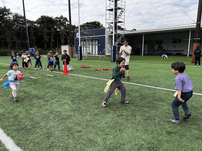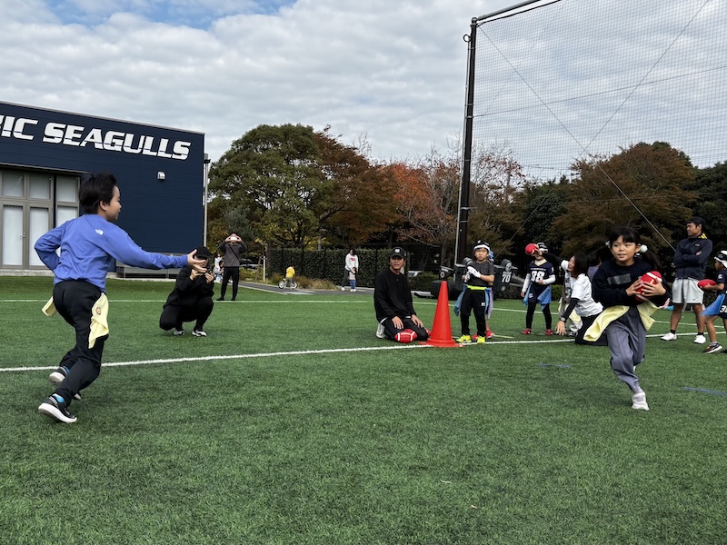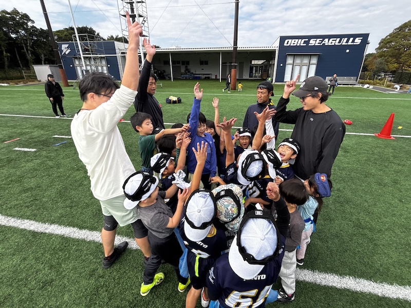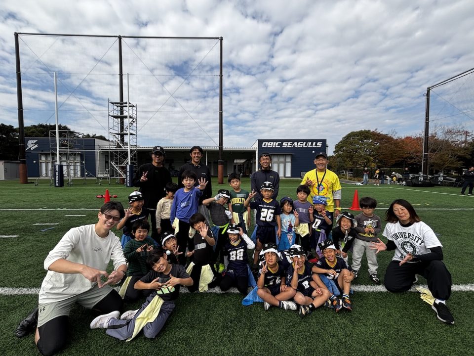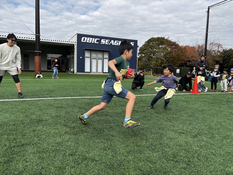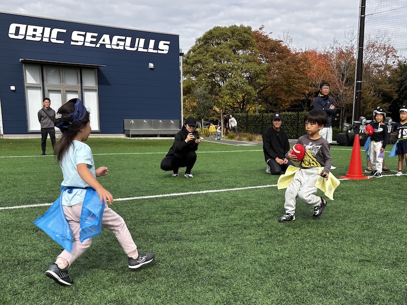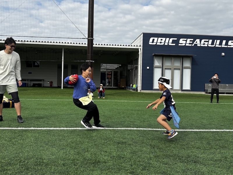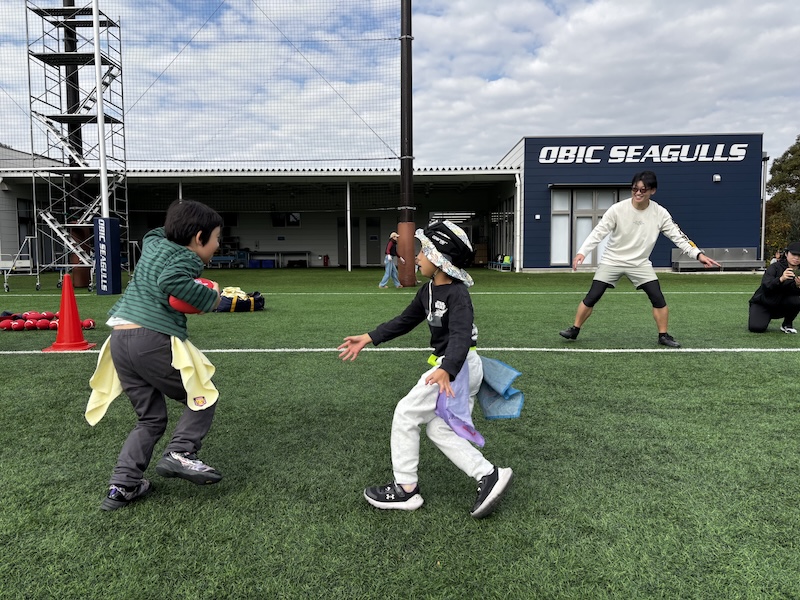 11月8日(土)「フラッグフットボールで遊ぶ日」を開催しました! 2025年11月10日 フラッグフットボールで遊ぶ日 オービック習志野グラウンドで毎月開催している、初心者大歓迎の「フラッグフットボールで遊ぶ日」。11月8日(土)も元気いっぱいの子どもたちが集まりました! 今回の参加者は19名。初めてボールを手にする子が多く、オービックシーガルズジュニアの低学年メンバーも一緒に楽しみました。 まずはみんな大好き「しっぽ取りゲーム」からスタート!走って、かわして、追いかけて──あちこちで歓声が飛び交いました。 続いて1vs1、2vs1の対戦形式にチャレンジ。相手の動きを読む真剣な表情と、タッチダウンした瞬間の嬉しそうな笑顔!まるで試合のような白熱した場面もたくさん見られ、みんなキラキラ輝いていました。 あっという間の75分間。ゲームが終わるたびに「もっとやりたい!」とコーチのまわりに集まる子どもたち。最後まで笑顔が絶えず、元気いっぱい走り回る姿が印象的でした。 フラッグフットボールは、男女・学年関係なく一緒に楽しめるスポーツ。鬼ごっこのような感覚で遊びながら、自然とチームワークや判断力も育まれます。「やってみたいけどちょっと恥ずかしい…」という子も、優しいコーチたちがしっかりサポートしてくれるので安心です! 次回は12/13(土)に開催。みんなで思いっきり走って、笑って、夢中になりましょう! Let’s play FLAG FOOTBALL!!