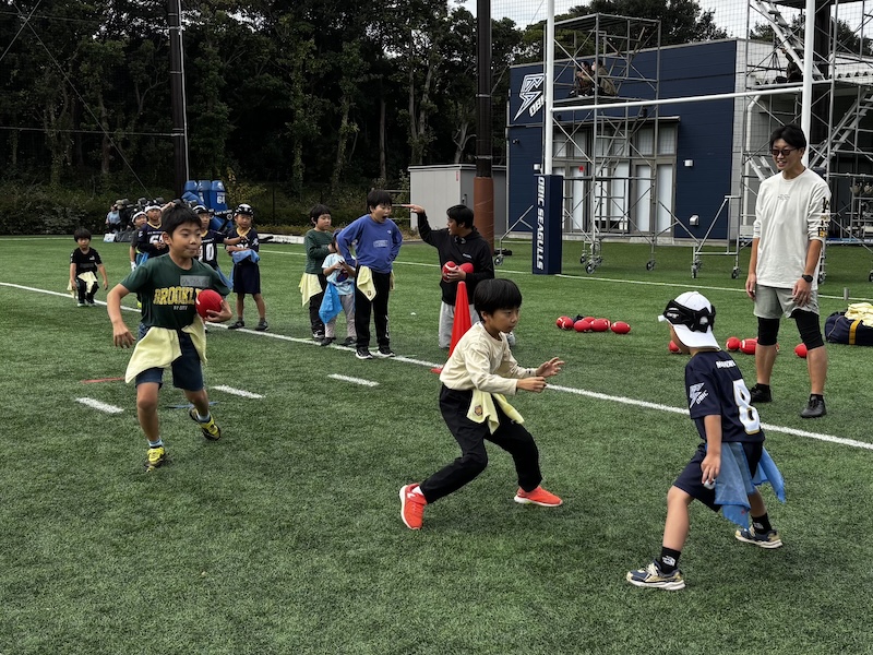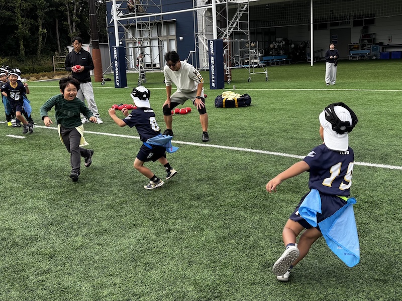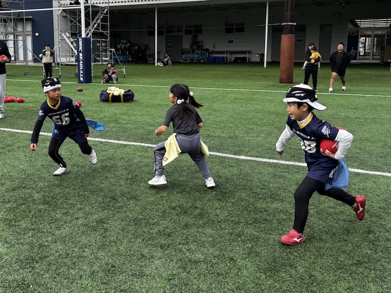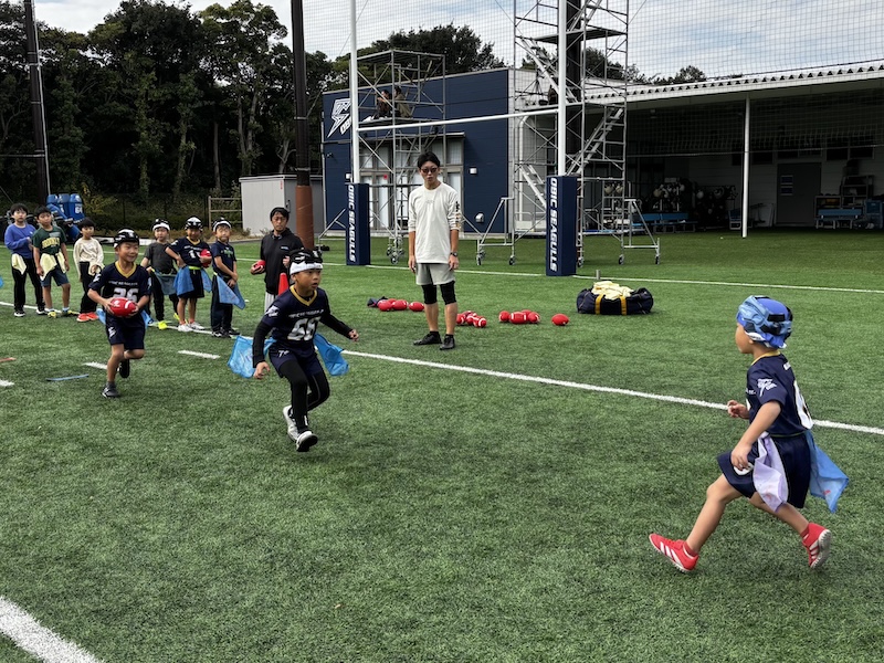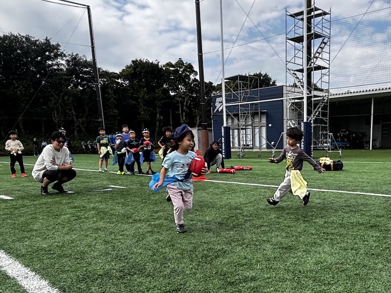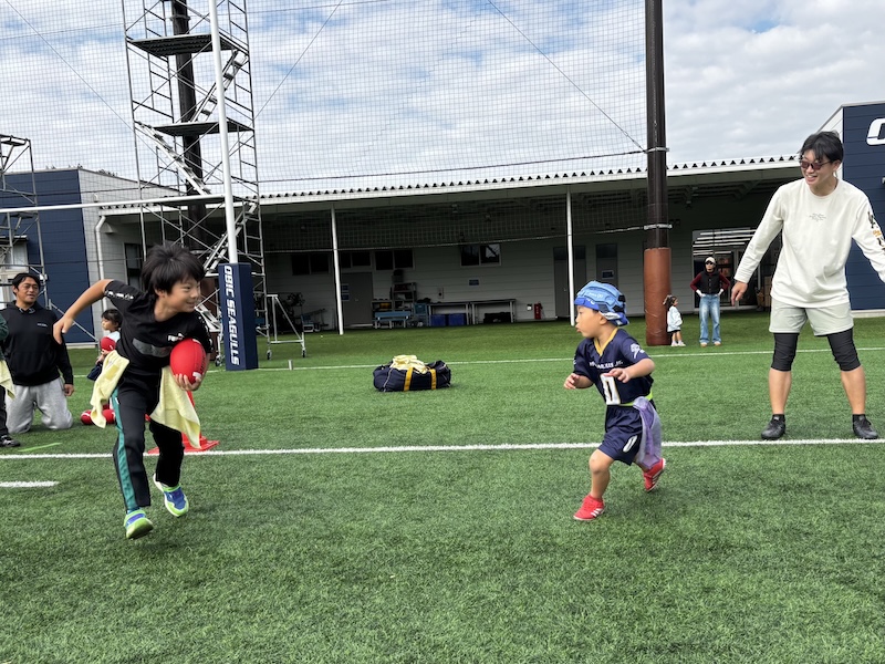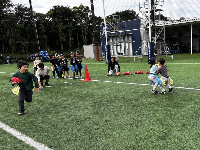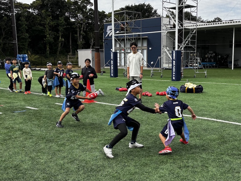 11月8日(土)「フラッグフットボールで遊ぶ日」を開催しました! 2025年11月10日 フラッグフットボールで遊ぶ日 オービック習志野グラウンドで毎月開催している、初心者大歓迎の「フラッグフットボールで遊ぶ日」。11月8日(土)も元気いっぱいの子どもたちが集まりました! 今回の参加者は19名。初めてボールを手にする子が多く、オービックシーガルズジュニアの低学年メンバーも一緒に楽しみました。 まずはみんな大好き「しっぽ取りゲーム」からスタート!走って、かわして、追いかけて──あちこちで歓声が飛び交いました。 続いて1vs1、2vs1の対戦形式にチャレンジ。相手の動きを読む真剣な表情と、タッチダウンした瞬間の嬉しそうな笑顔!まるで試合のような白熱した場面もたくさん見られ、みんなキラキラ輝いていました。 あっという間の75分間。ゲームが終わるたびに「もっとやりたい!」とコーチのまわりに集まる子どもたち。最後まで笑顔が絶えず、元気いっぱい走り回る姿が印象的でした。 フラッグフットボールは、男女・学年関係なく一緒に楽しめるスポーツ。鬼ごっこのような感覚で遊びながら、自然とチームワークや判断力も育まれます。「やってみたいけどちょっと恥ずかしい…」という子も、優しいコーチたちがしっかりサポートしてくれるので安心です! 次回は12/13(土)に開催。みんなで思いっきり走って、笑って、夢中になりましょう! Let’s play FLAG FOOTBALL!!