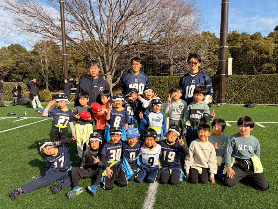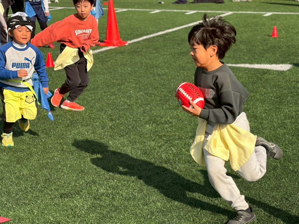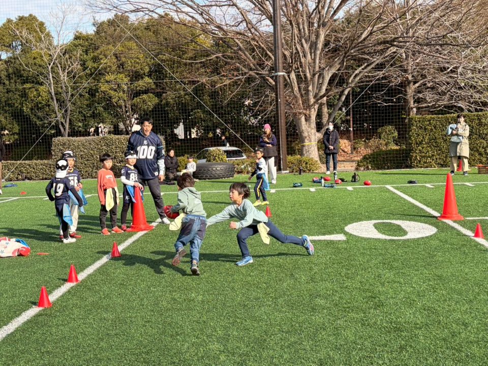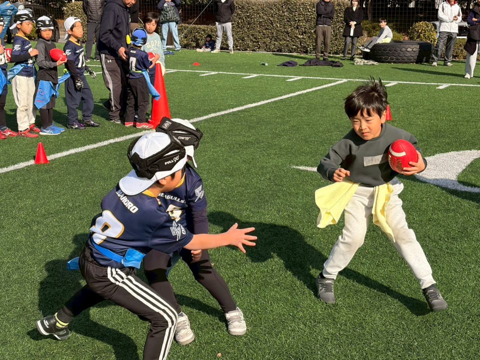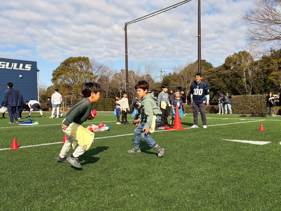 12月13日(土)「フラッグフットボールで遊ぶ日」を開催しました! 2025年12月17日 フラッグフットボールで遊ぶ日 12月13日(土)、オービック習志野グラウンドにて「フラッグフットボールで遊ぶ日(体験教室)」を開催しました。 このイベントは、毎月1回行っている初めての子大歓迎の体験会。小学生なら誰でも参加OKで、学年の区別なく、みんな一緒に楽しめるのが魅力です。鬼ごっこの延長のような感覚で遊べるので、運動に少し苦手意識がある子でも自然と体が動き出します。「初めてでドキドキする」「うまくできるかな?」そんな気持ちを抱えた子もいましたが、子どもたちと日頃から向き合っているコーチ陣が、一人ひとりの様子を見ながら声をかけ、安心してチャレンジできる雰囲気をつくってくれました。 この日の参加者は18名。初参加の子どもたちに加え、オービックシーガルズジュニアの低学年キッズも一緒にグラウンドへ。 プログラムは、しっぽ取りゲームからスタートし、パスキャッチ競争、1vs1、2vs1と段階的にレベルアップ。初めは思うようにいかなくても、繰り返すうちに少しずつ成功体験が増えていきます。「できた!」という瞬間の表情はどの子も本当に嬉しそうで、子どもたちが持っている力の大きさを改めて感じる時間となりました。 対戦形式のゲームでは、自然と熱が入り、真剣な表情に。それでも終わればすぐに笑顔に戻り、また次のチャレンジへ。気がつけば75分はあっという間で、最後まで元気いっぱいグラウンドを駆け回っていました。 フラッグフットボールは、見るだけでは伝わらない楽しさがあります。思い切って一歩踏み出すと、きっと「またやりたい!」に変わるはず。 次回も、走って、笑って、夢中になれる時間を一緒に過ごしましょう!Let’s play FLAG FOOTBALL!!