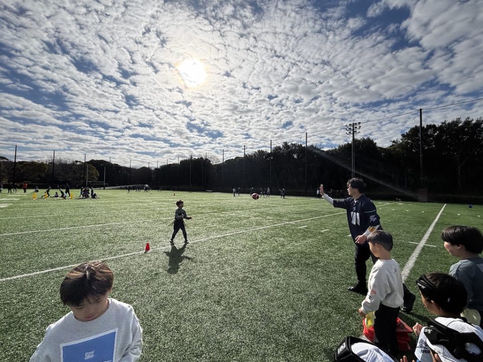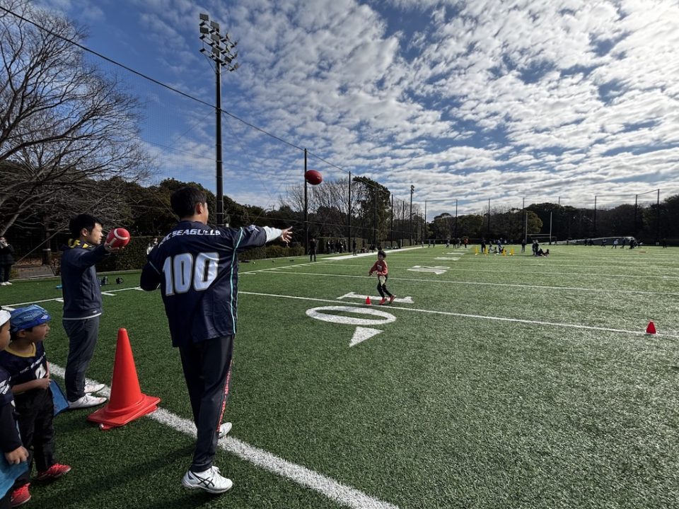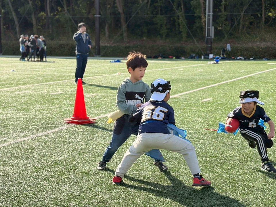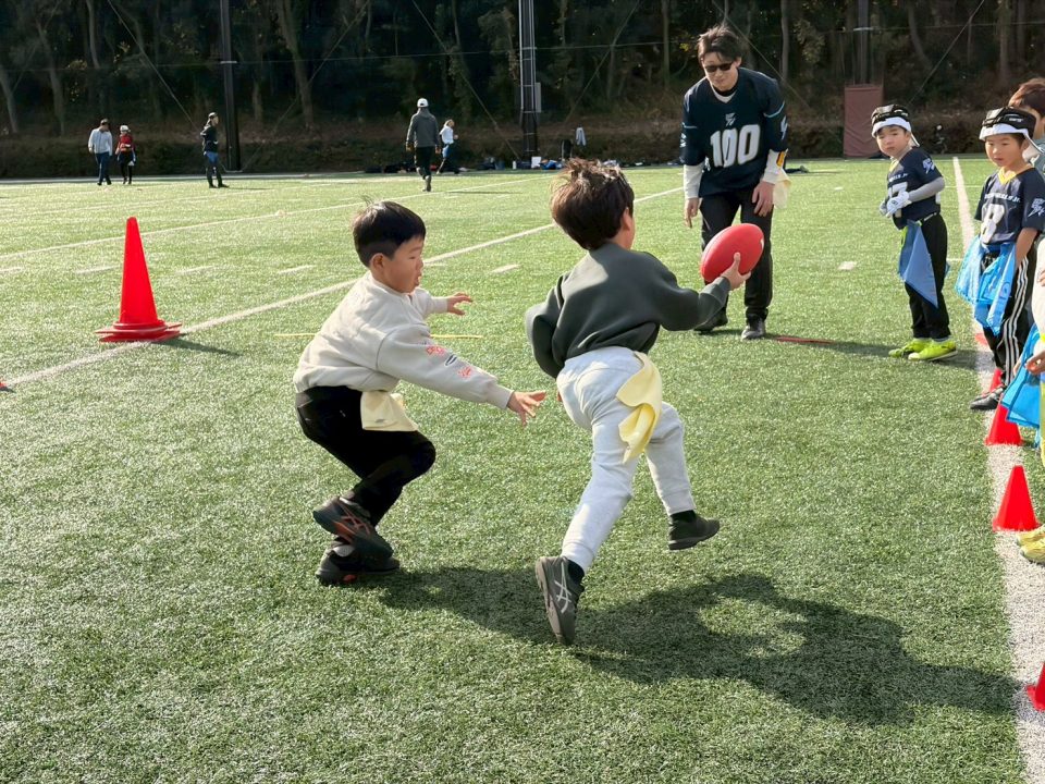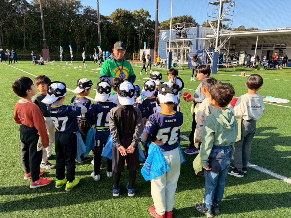12月13日(土)「フラッグフットボールで遊ぶ日」を開催しました! 2025年12月17日 フラッグフットボールで遊ぶ日 12月13日(土)、オービック習志野グラウンドにて「フラッグフットボールで遊ぶ日(体験教室)」を開催しました。 このイベントは、毎月1回行っている初めての子大歓迎の体験会。小学生なら誰でも参加OKで、学年の区別なく、みんな一緒に楽しめるのが魅力です。鬼ごっこの延長のような感覚で遊べるので、運動に少し苦手意識がある子でも自然と体が動き出します。「初めてでドキドキする」「うまくできるかな?」そんな気持ちを抱えた子もいましたが、子どもたちと日頃から向き合っているコーチ陣が、一人ひとりの様子を見ながら声をかけ、安心してチャレンジできる雰囲気をつくってくれました。 この日の参加者は18名。初参加の子どもたちに加え、オービックシーガルズジュニアの低学年キッズも一緒にグラウンドへ。 プログラムは、しっぽ取りゲームからスタートし、パスキャッチ競争、1vs1、2vs1と段階的にレベルアップ。初めは思うようにいかなくても、繰り返すうちに少しずつ成功体験が増えていきます。「できた!」という瞬間の表情はどの子も本当に嬉しそうで、子どもたちが持っている力の大きさを改めて感じる時間となりました。 対戦形式のゲームでは、自然と熱が入り、真剣な表情に。それでも終わればすぐに笑顔に戻り、また次のチャレンジへ。気がつけば75分はあっという間で、最後まで元気いっぱいグラウンドを駆け回っていました。 フラッグフットボールは、見るだけでは伝わらない楽しさがあります。思い切って一歩踏み出すと、きっと「またやりたい!」に変わるはず。 次回も、走って、笑って、夢中になれる時間を一緒に過ごしましょう!Let’s play FLAG FOOTBALL!!